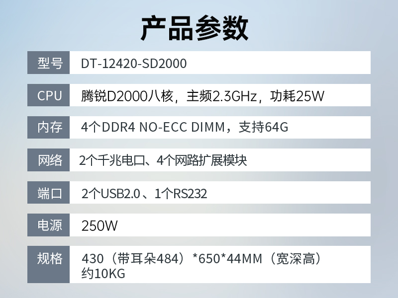 東田1U多網口工控機DT-12420-SD2000,搭載國產八核高性能CPU;模塊多樣豐富,四種擴展模塊滿足多種擴展需求,8個電口、4個千兆光口、2萬兆光口;多種存儲方式靈活搭配,1個Msata、6個SATA2.01個Minipcie、CF卡。